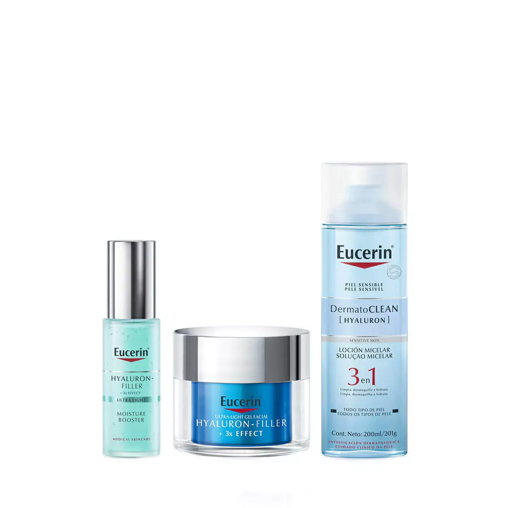 Combo Eucerin Hyaluron Filler Hydrating Booster x 30 ml + Crema x 50 ml + Locion Limpiadora Dermatoclean x 200 ml